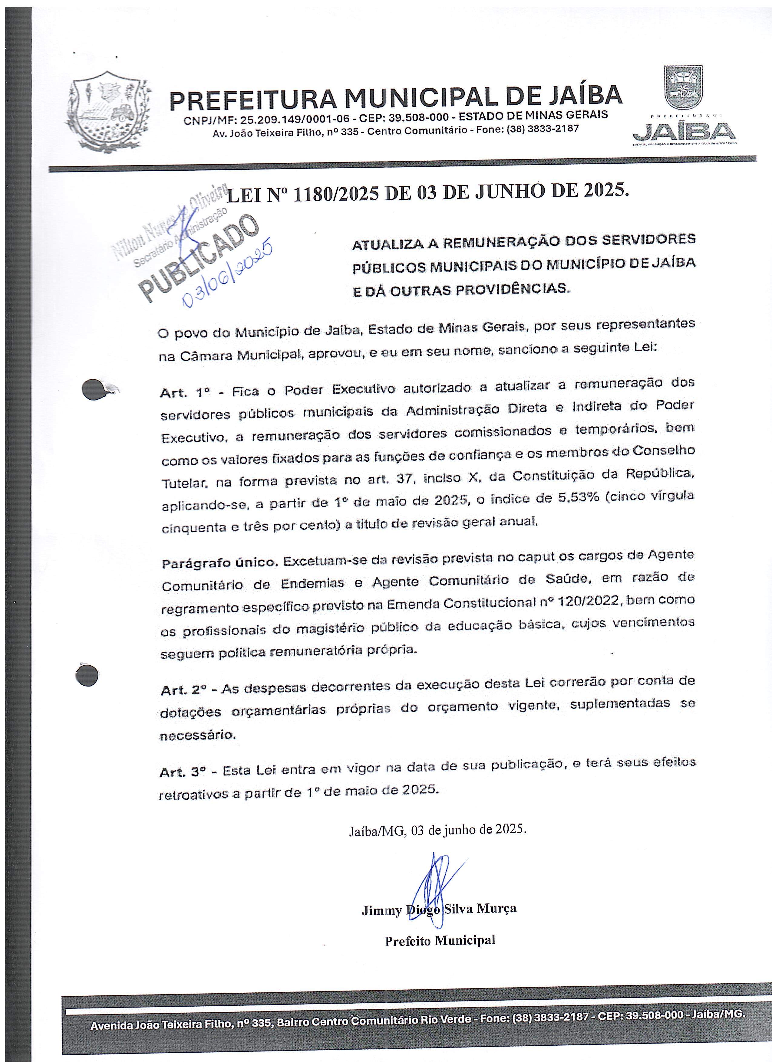 LEI N° 1.180/2025 DE 03 DE JUNHO DE 2025. ATUALIZA A REMUNERÇÃO DOS SERVIDORES PÚBLICOS MUNICIPAIS DO MUNICÍPIO DE JAÍBA E DÁ OUTRAS PROVIDÊNCIAS.