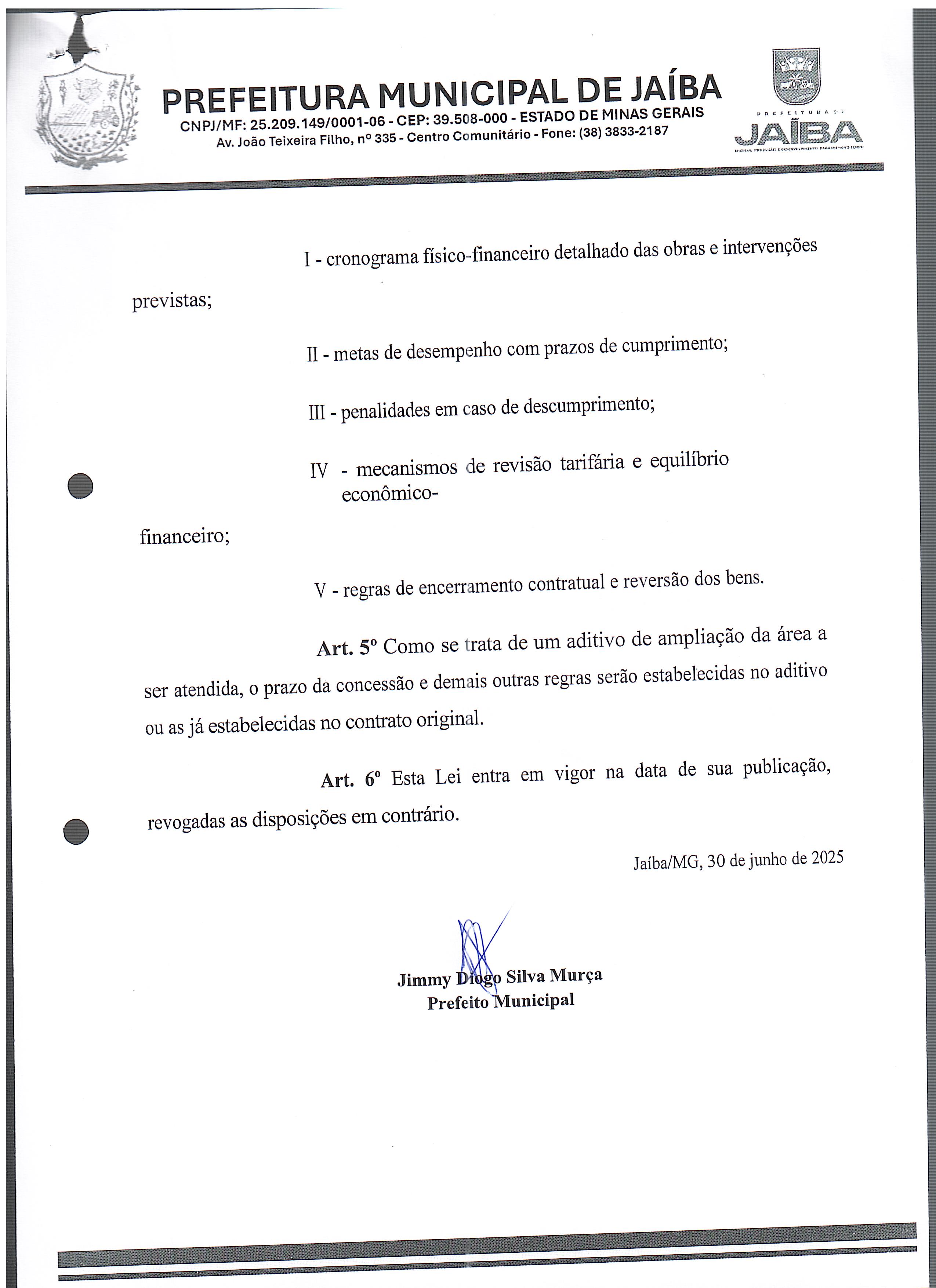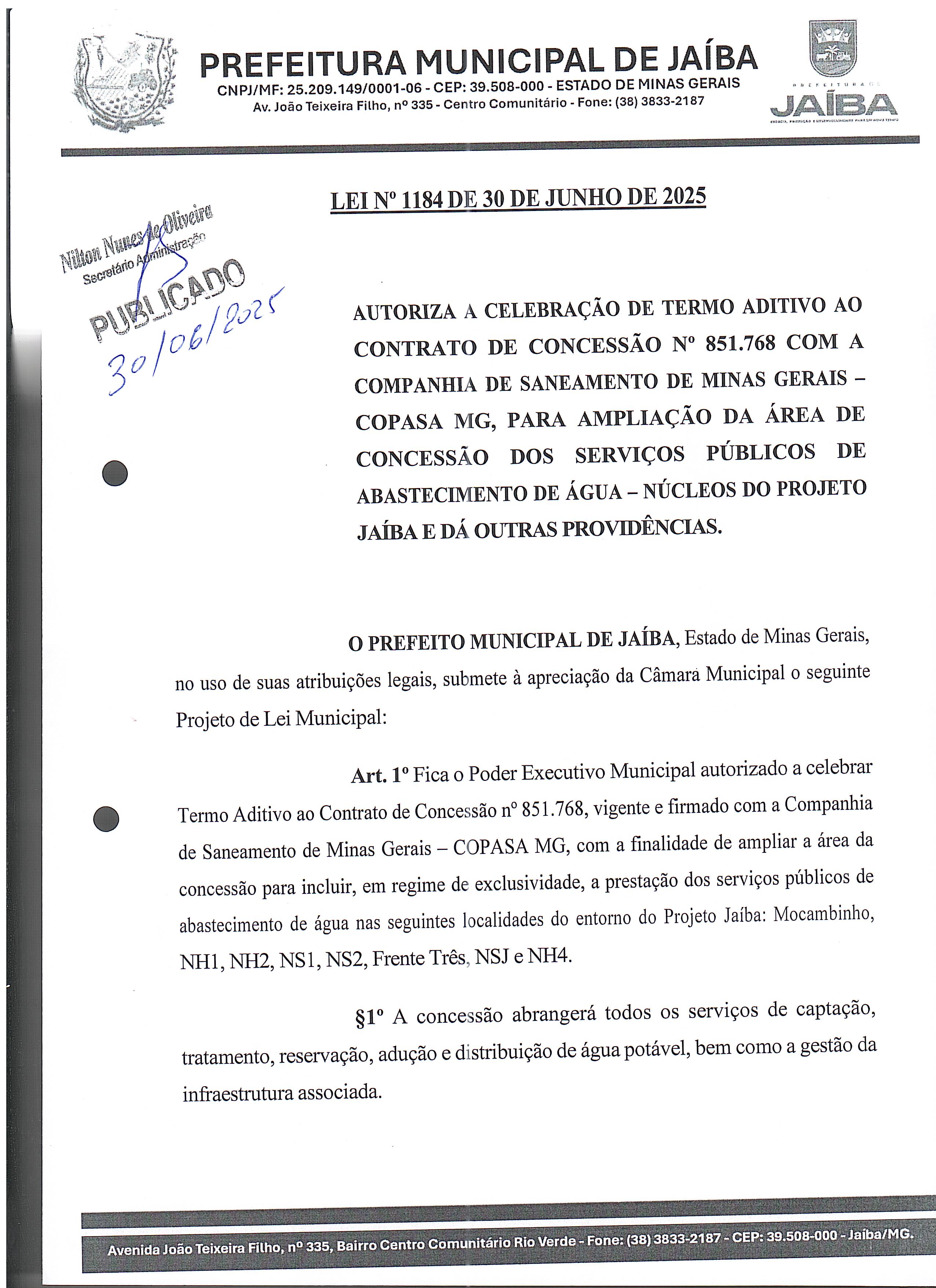 LEI N° 1.184 DE 30 DE JUNHO DE 2025 AUTORIZA A CELEBRAÇÃO DE TERMO ADITIVO AO CONTRATO DE CONCESSÃO N° 851.768 COM A COMAPNHIA DE SANEAMENTO DE MINAS GERAIS - COPASA MG, PARA AMPLIAÇÃO DA ÁREA DE CONCESSÃO DOS SERVIÇOS PÚBLICOS DE ABASTECIMENTO DE ÁGUA - NÚCLEOS DO PROJETO JAÍBA E DÁ OUTRAS PROVIDÊNCIAS